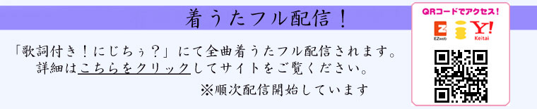 ●有線放送 ●着うたフル ●iTunes ●WEB掲載 ◇リクエスト方法はこちらをご覧ください 配信中(3.5現在) ☆贖罪の聖母 ☆ロコモーション・ドリーム[カバー] ☆輝きの描写[カバー] ☆Fight!〜Rock Ver.[カバー] 配信開始までもう少々お待ちください(3.5現在)。 ☆プレセペ[アニメファン向けポータル&コミュニティサイト] ☆ZAKZAKアニメ&声優 ☆アニメーション情報サイト 青月 ☆AK!BA.TV