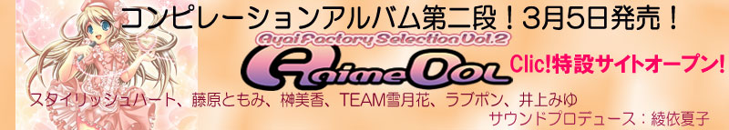 ![]() | ◆コンピレーションアルバムプロデュース 【全面プロデュース】 2010年3月5日全国発売 「Ayai Factory Selection Vol.2 AnimeDOL」 ¥3,000 発売元:Ayai Factory |